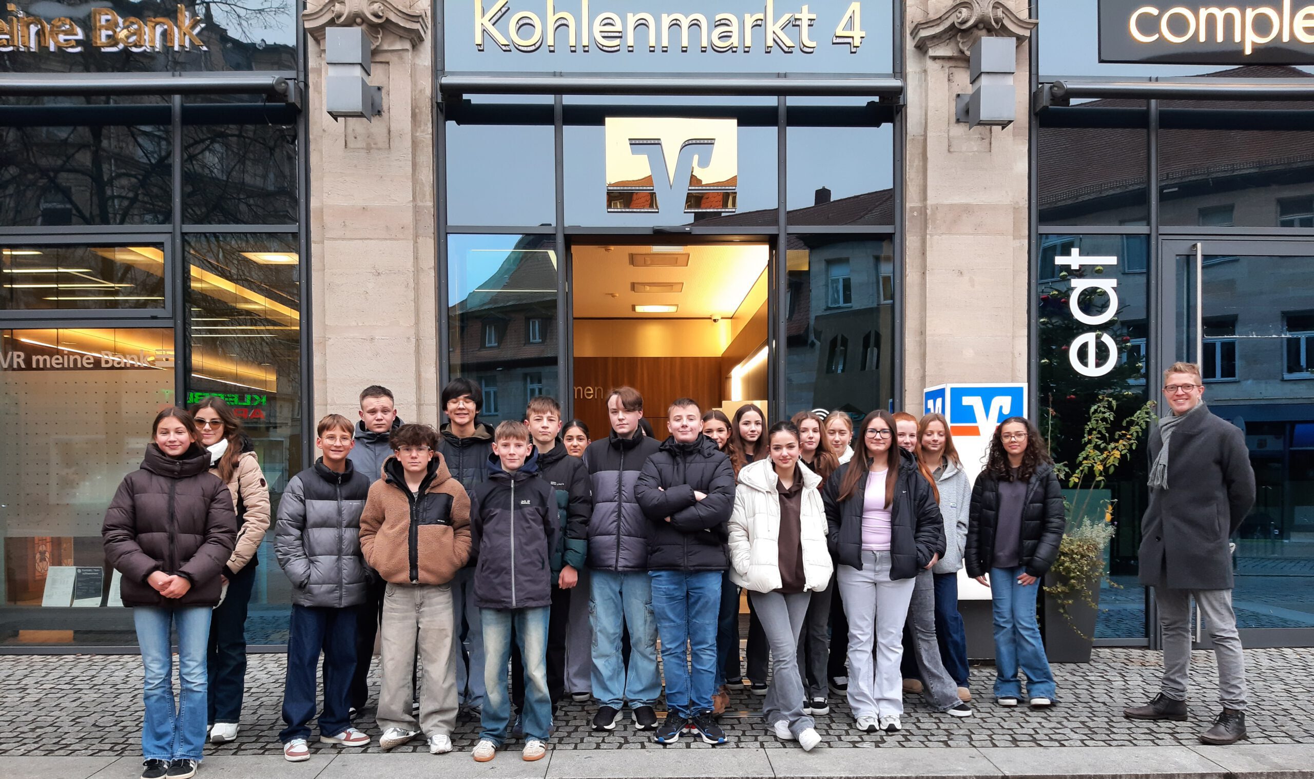 Am 18.11.2025 besuchten die Schülerinnen und Schüler der Klasse 8b die VR Bank-Filiale am Kohlenmarkt in Fürth. In einem einstündigen Vortrag erfuhren sie alles Wissenswerte rund um die Themen Girokonto, Zahlungsarten sowie zur Anlage erster Ersparnisse. Es folgte eine Führung durch die Filiale, bei der nicht nur der Vorraum, mit Geldausgabe- und Einzahlungsautomat sowie Kontoauszugsdrucker und Münzeinzahler besichtigt wurden, sondern auch die oberen Stockwerke mit den Büros der Fachberater für Privat- und Unternehmenskunden sowie im Kellergeschoss der Raum mit den Schließfächern. In einer abschließenden Fragerunde wurden Einblicke in die Anforderungen und den Ablauf einer Ausbildung zur Bankkauffrau bzw. zum Bankkaufmann gegeben. Für den gelungenen Vormittag möchten sich die Schülerinnen und Schüler der Klasse 8 b bei der VR-Bank Fürth, insbesondere Frau Gertner und Frau Jahn, ganz herzlich bedanken.