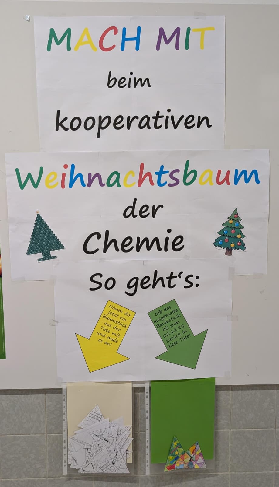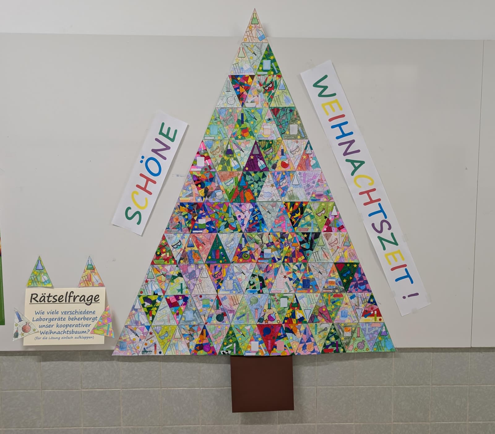 In der Vorweihnachtszeit ist in unserem Chemiegang ein besonderer Weihnachtsbaum entstanden: ein kooperativer Chemistree! Im Gegensatz zu normalen Weihnachtsbäumen, die mit Kugeln und Lichterkette geschmückt werden, erstrahlt unser Weihnachtsbaum in bunten Farben aus vielen zusammengesetzten Dreiecken. Jedes dieser Baustücke enthält die Umrisse eines Laborgeräts – vom Erlenmeyerkolben bis zum Reagenzglas. Über viele Jahrgangsstufen hinweg wurde von sämtlichen Schülerinnen und Schülern ein Dreieck ausgemalt und zu unserem farbenfrohen Chemistree-Kunstwerk zusammengesetzt.