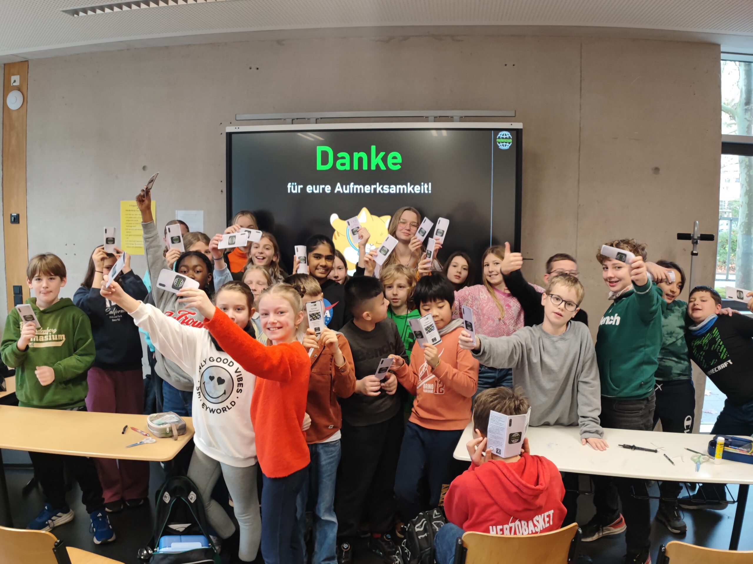 In den letzten beiden Schulwochen konnten unsere Scouts ihre neu gewonnenen Erkenntnisse schließlich direkt bei den Vorträgen in den fünften Klassen anwenden. Besonders aufregend war dies für die zahlreichen Neuzugänge, die zum Teil ihre allerersten Vorträge hielten – eine Herausforderung, die sie durchweg hervorragend meisterten. Die Fünftklässler wussten das Engagement der Scouts sehr zu schätzen, arbeiteten begeistert mit und freuten sich über ihre neuen „Handys“ aus Papier. Einmal mehr zeigte sich dabei, wie viel Freude Medienkompetenz machen kann, wenn sie von Jugendlichen für Jugendliche vermittelt wird.