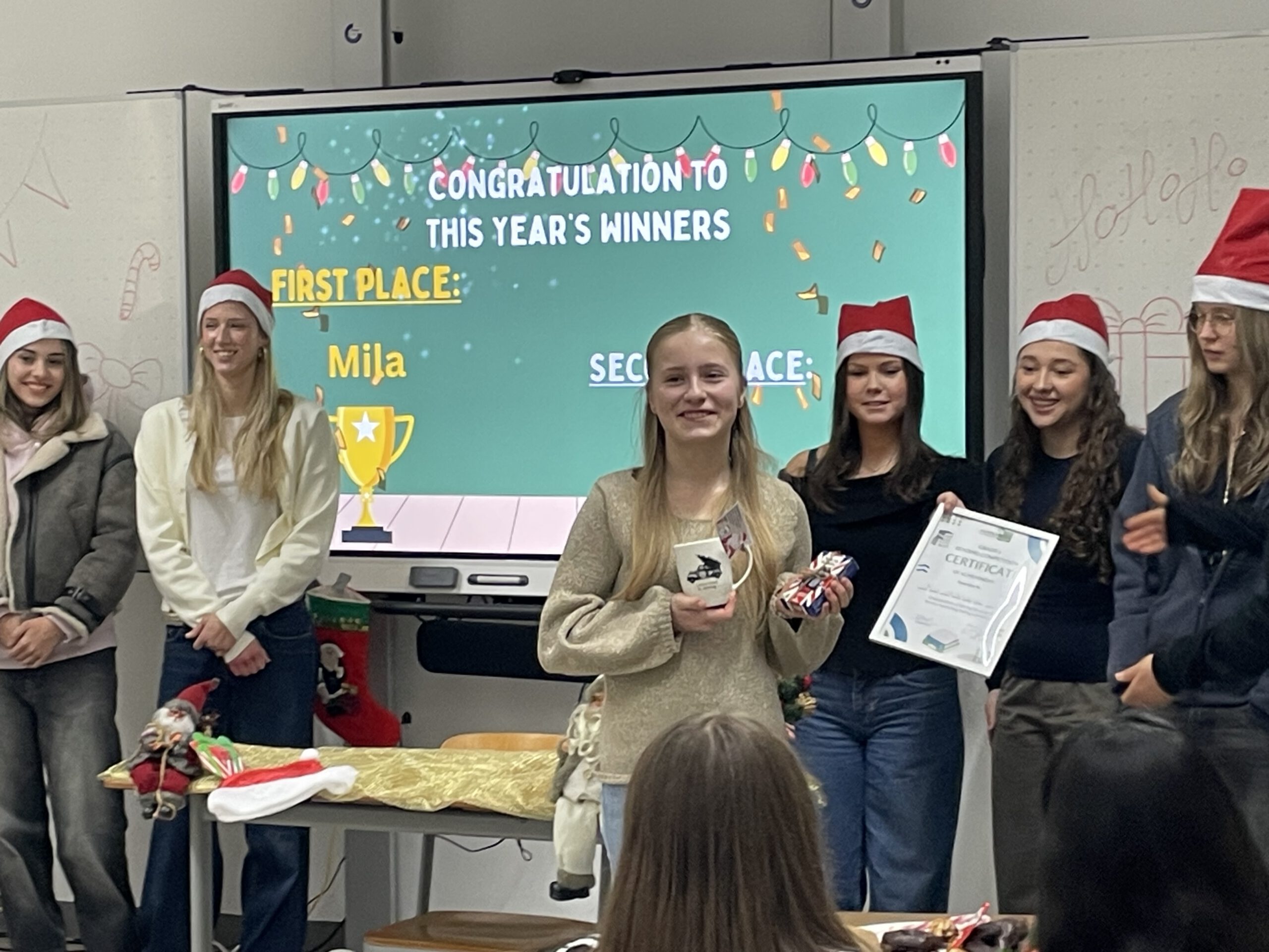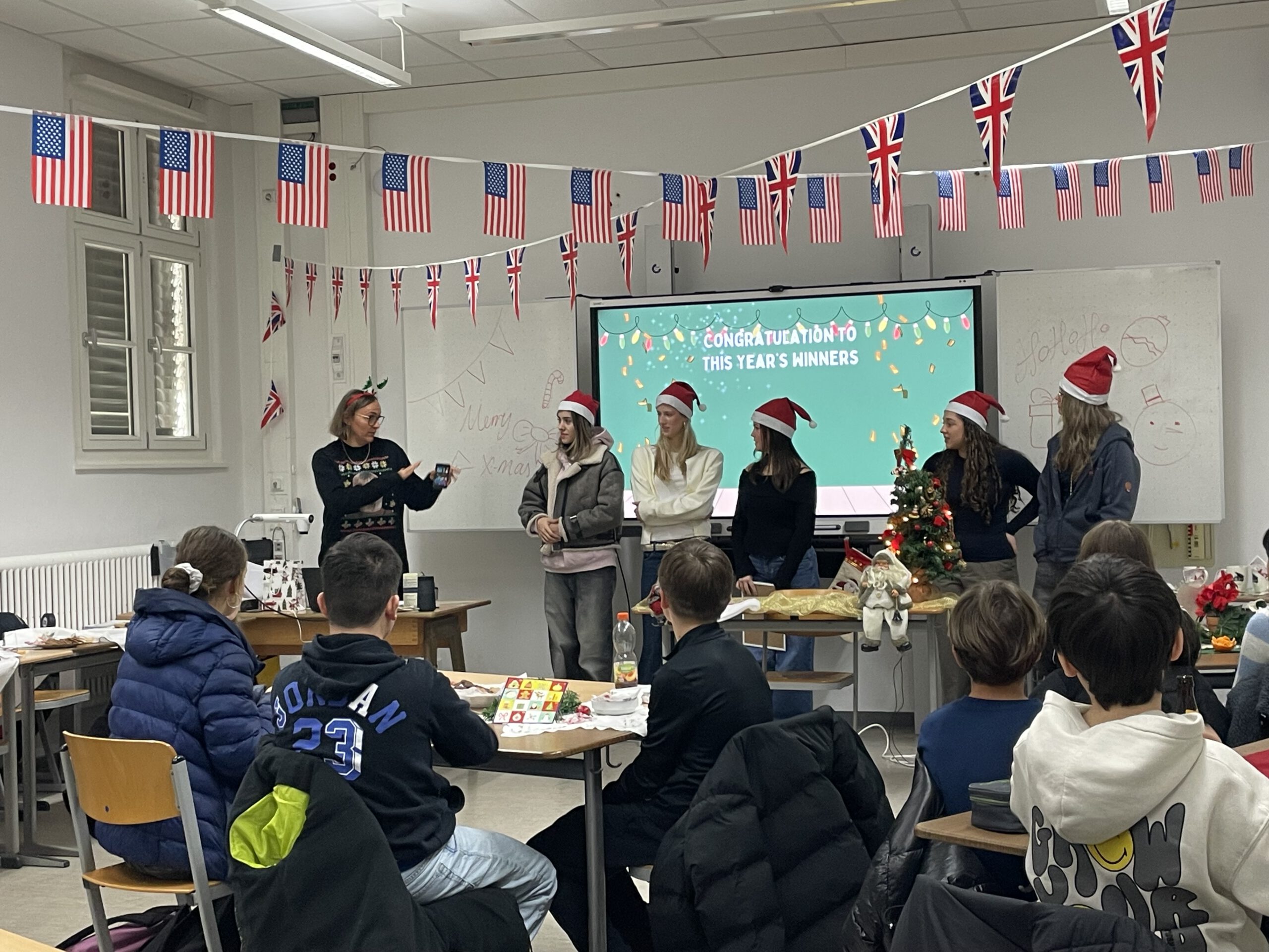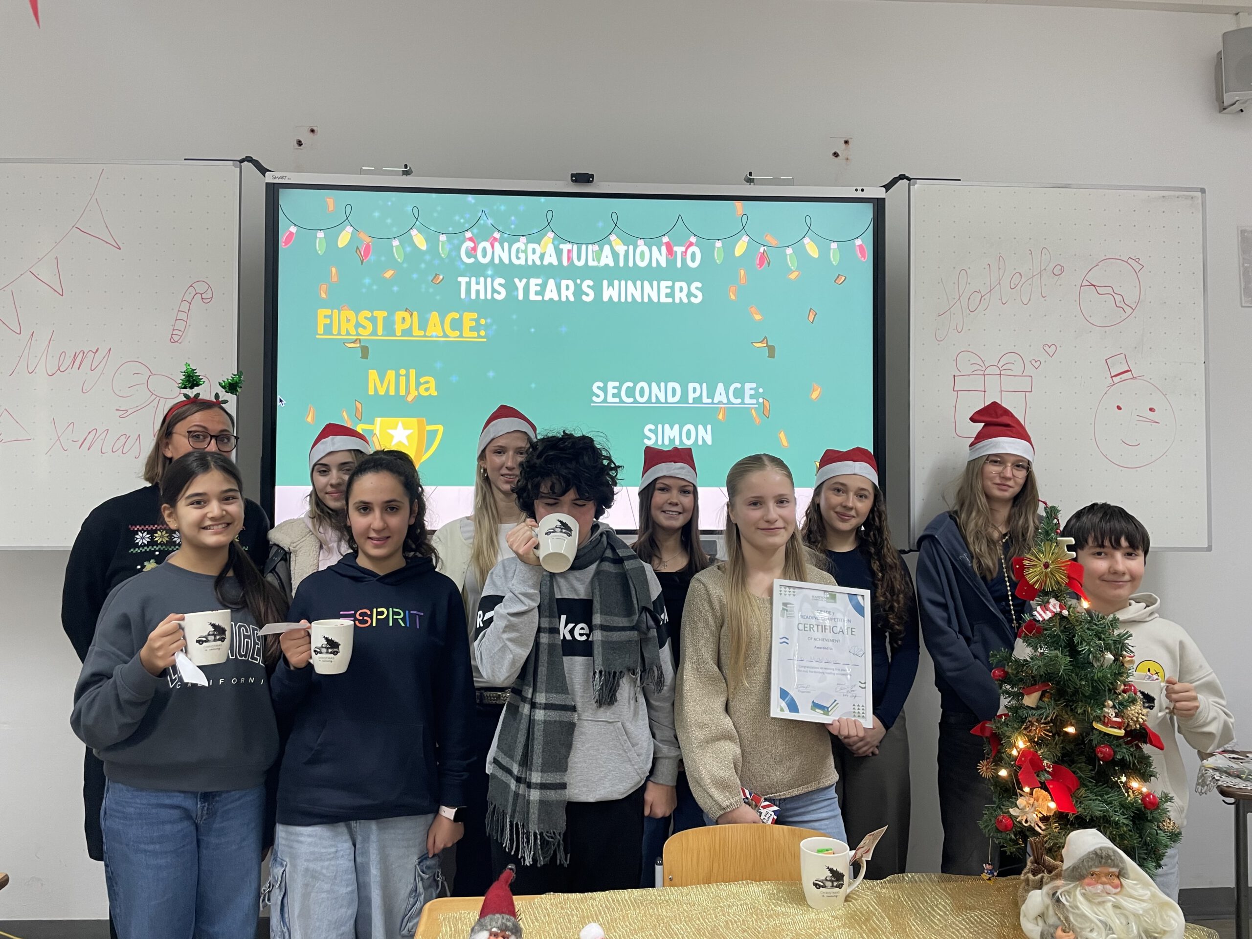 Am Freitag, den 19. Dezember, direkt vor Ferienbeginn, trafen sich alle Vortragenden gemeinsam mit ihren jeweils vier Unterstützerinnen und Unterstützern im weihnachtlich dekorierten Klassenzimmer, um den Schulentscheid des englischen Vorlesewettbewerbs auszutragen. Aus unseren fünf 7. Klassen hatten Melik Erol (7a), Simon Siewert (7b), Mila Nedeljkovic (7c), Ela Sezer (7d) und Aleyna Yilmaz (7e) als Klassensiegerinnen und -sieger qualifiziert und traten nun gegeneinander an. Für echte Weihnachtsstimmung sorgten ein Christmas Quiz, Christmas Karaoke sowie Weihnachtsgebäck für das Publikum. In Runde eins präsentierten die Teilnehmenden ihre sehr gut vorbereiteten englischen Texte. Die zweite Runde stellte eine besondere Herausforderung dar: Ein unvorbereiteter Text musste spontan vorgelesen werden – das Publikum durfte so fünf verschiedenen englischen Weihnachtsgeschichten lauschen. Alle Vorträge waren hervorragend, weshalb die Jury vor einer echten Herausforderung stand. Die Q12-Schülerinnen Lilly Fischer, Edina Bicaj, Yuna Gossmann und Helena Löhle sowie die Vorjahressiegerin Fenja Kerker (8a) hörten aufmerksam zu, diskutierten intensiv und bewiesen dabei nicht nur Fairness, sondern auch ein feines Gespür für Aussprache und Textverständnis. Am Ende belegte Simon Siewert aus der 7b den 2. Platz. Unsere Schulsiegerin wurde Mila Nedeljkovic aus der 7c, die Ende Februar an der FAU beim Bezirksentscheid gegen die besten Vorleserinnen und Vorleser aus Mittelfranken antreten wird.