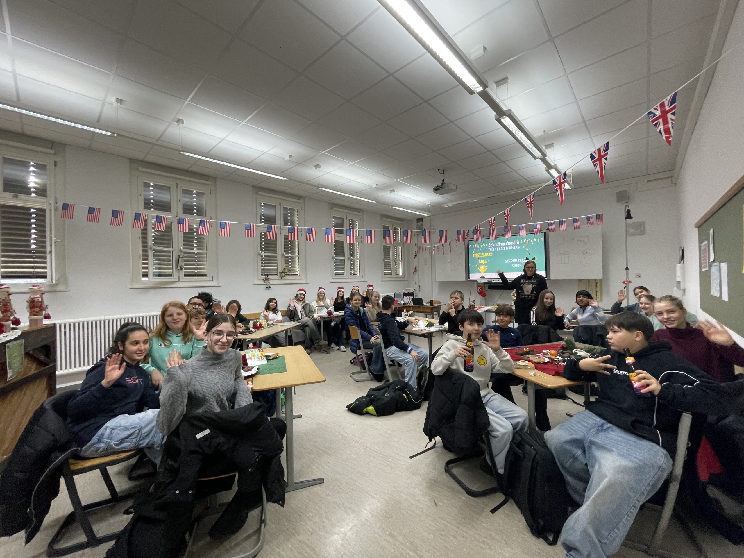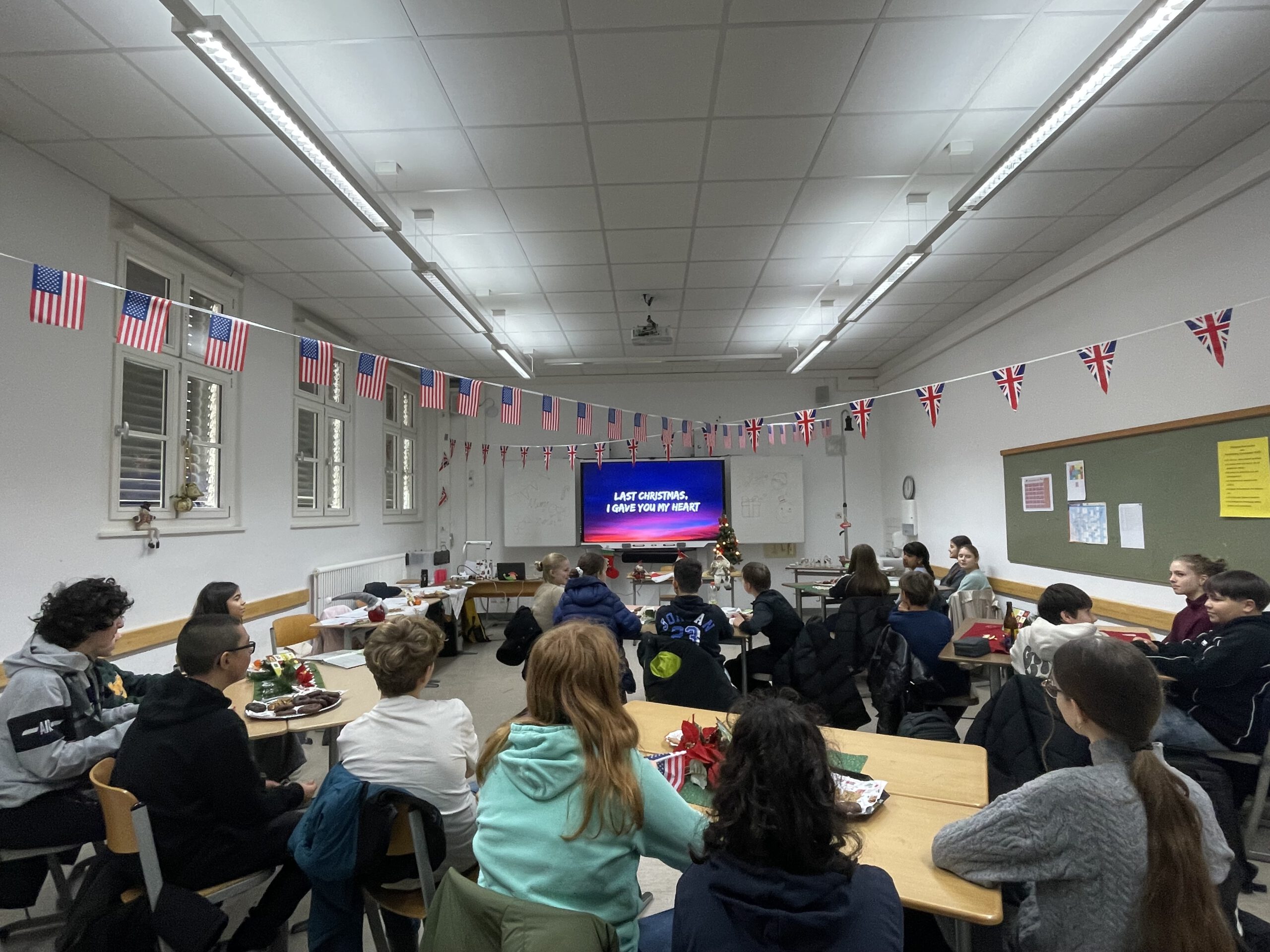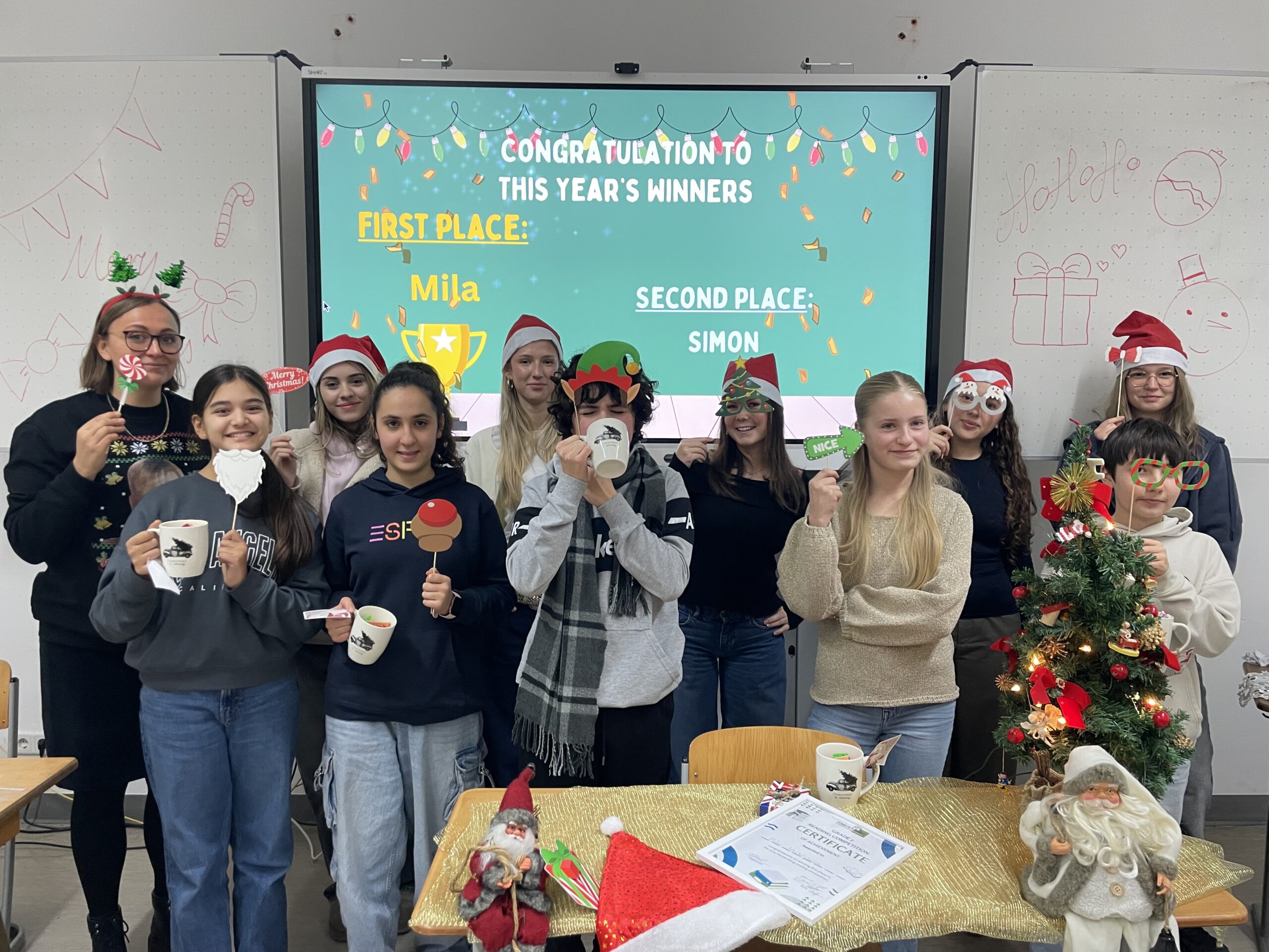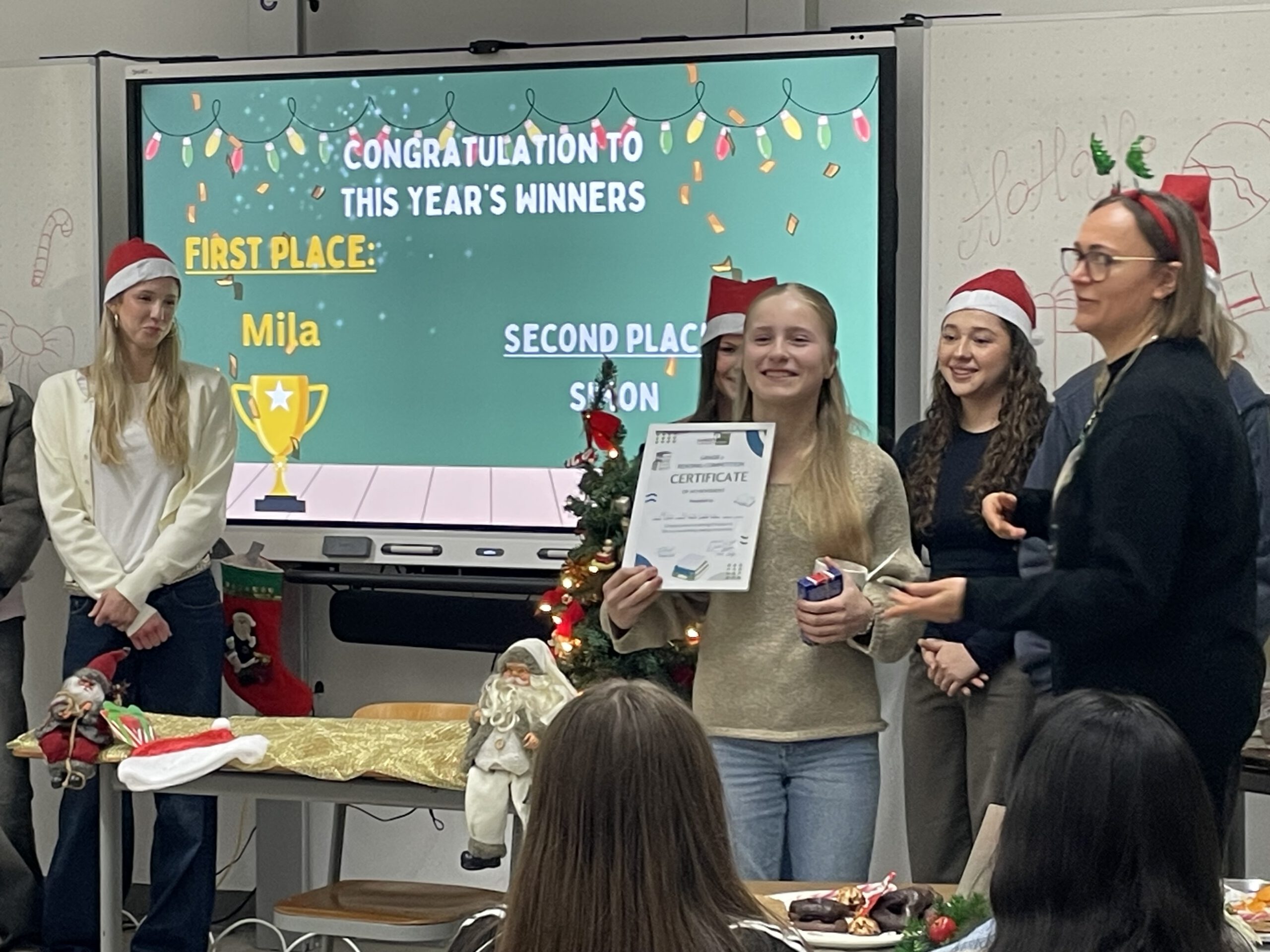 Am Freitag, den 19. Dezember, direkt vor Ferienbeginn, trafen sich alle Vortragenden gemeinsam mit ihren jeweils vier Unterstützerinnen und Unterstützern im weihnachtlich dekorierten Klassenzimmer, um den Schulentscheid des englischen Vorlesewettbewerbs auszutragen. Aus unseren fünf 7. Klassen hatten Melik Erol (7a), Simon Siewert (7b), Mila Nedeljkovic (7c), Ela Sezer (7d) und Aleyna Yilmaz (7e) als Klassensiegerinnen und -sieger qualifiziert und traten nun gegeneinander an. Für echte Weihnachtsstimmung sorgten ein Christmas Quiz, Christmas Karaoke sowie Weihnachtsgebäck für das Publikum. In Runde eins präsentierten die Teilnehmenden ihre sehr gut vorbereiteten englischen Texte. Die zweite Runde stellte eine besondere Herausforderung dar: Ein unvorbereiteter Text musste spontan vorgelesen werden – das Publikum durfte so fünf verschiedenen englischen Weihnachtsgeschichten lauschen. Alle Vorträge waren hervorragend, weshalb die Jury vor einer echten Herausforderung stand. Die Q12-Schülerinnen Lilly Fischer, Edina Bicaj, Yuna Gossmann und Helena Löhle sowie die Vorjahressiegerin Fenja Kerker (8a) hörten aufmerksam zu, diskutierten intensiv und bewiesen dabei nicht nur Fairness, sondern auch ein feines Gespür für Aussprache und Textverständnis. Am Ende belegte Simon Siewert aus der 7b den 2. Platz. Unsere Schulsiegerin wurde Mila Nedeljkovic aus der 7c, die Ende Februar an der FAU beim Bezirksentscheid gegen die besten Vorleserinnen und Vorleser aus Mittelfranken antreten wird.