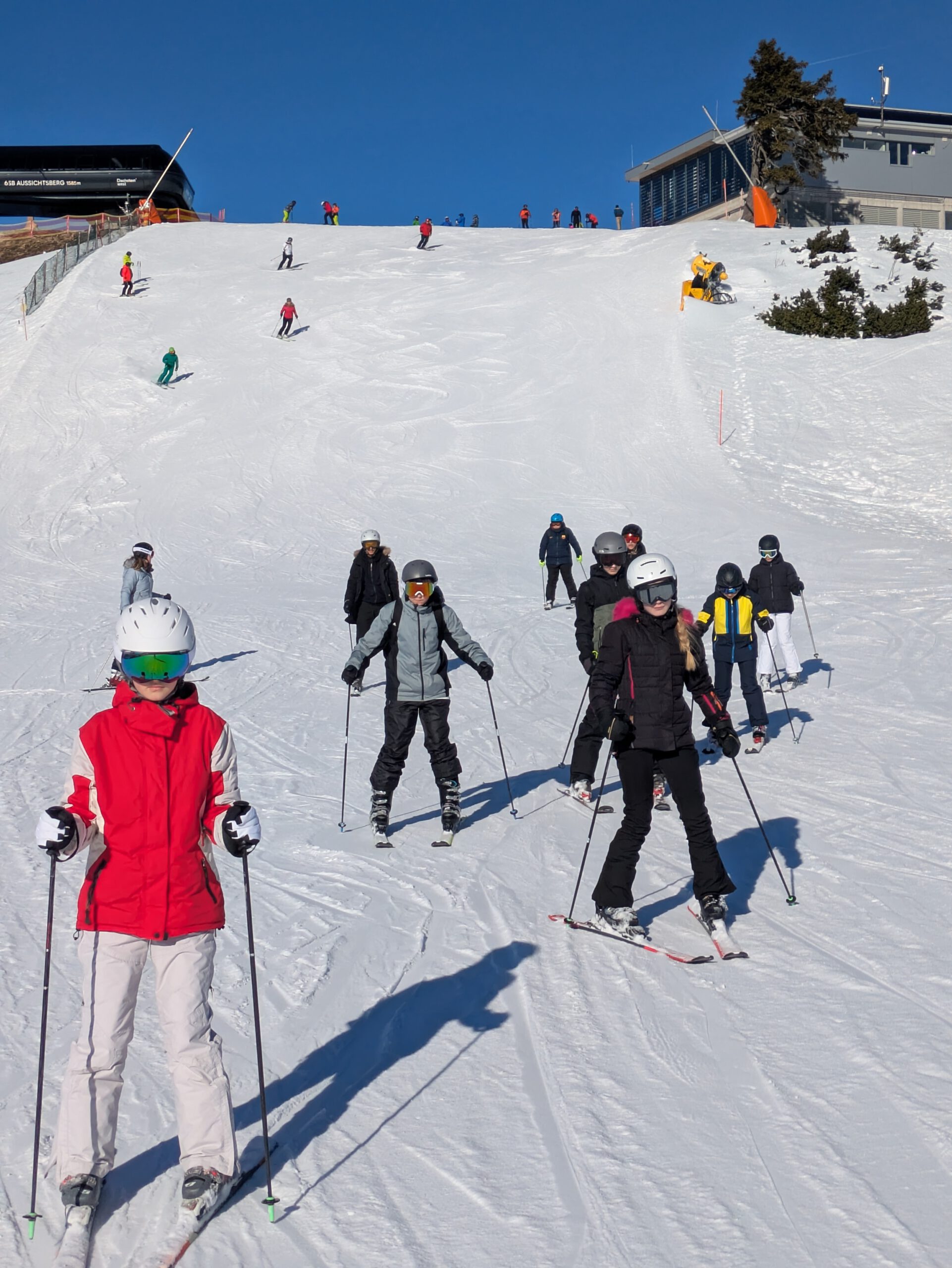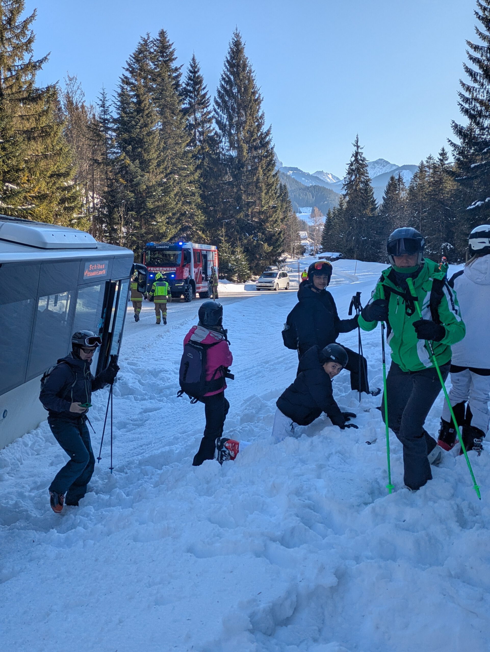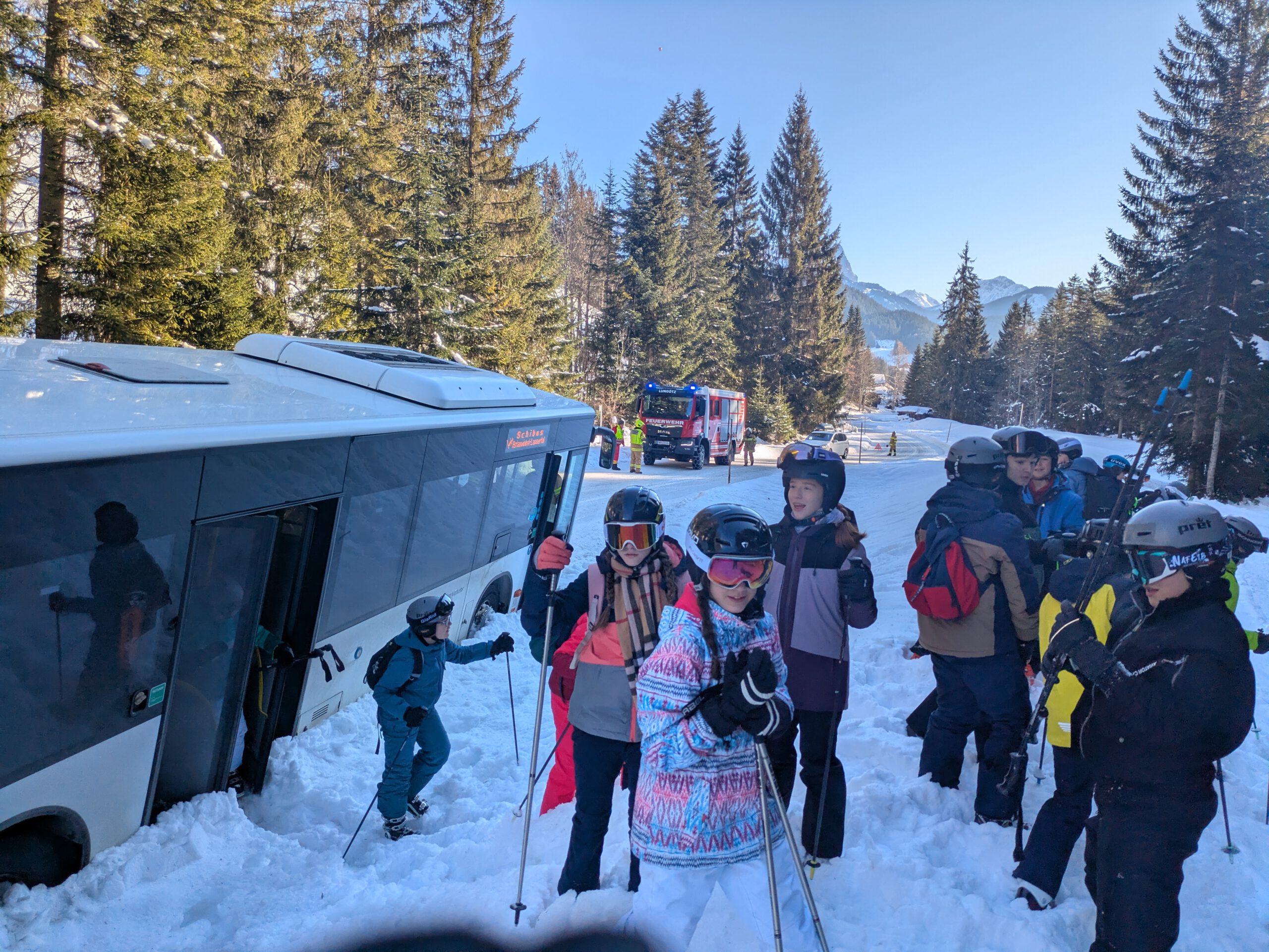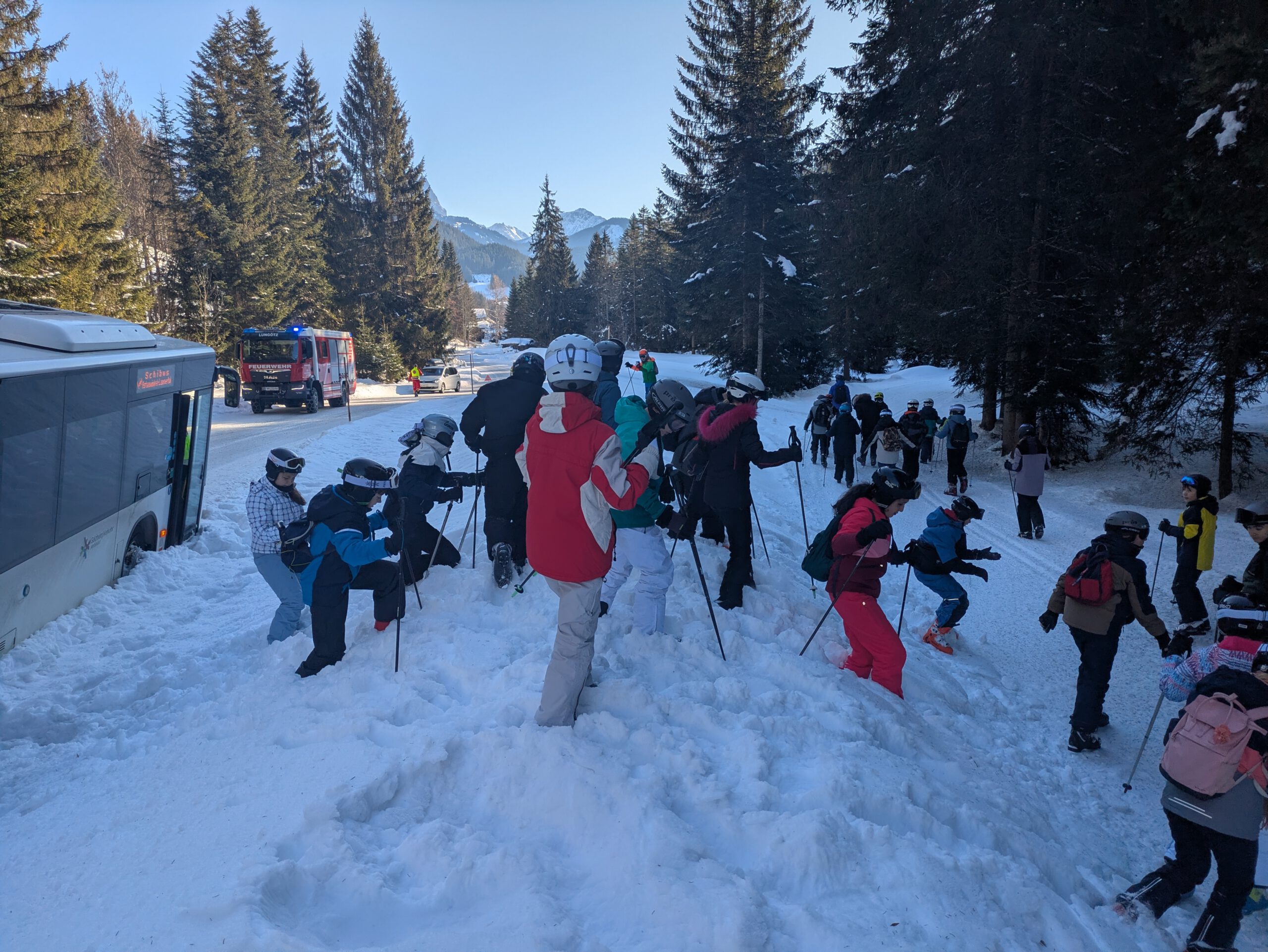 Auf dem Weg zum Skigebiet fuhr sich am Dienstagvormittag der Skibus wegen eines entgegenkommenden LKWs im Schnee fest. Im Bus saßen zahlreiche Schülerinnen und Schüler des HGF, die den Bus verlassen mussten, damit die Feuerwehr den festgefahrenen Bus mit der Seilwieder herausziehen konnte. Die HGFler nutzen die Chance zu einer Rutschpartie bzw. Rollerfässchen im Schnee. Endlich im Skigebiet angekommen, ging es dann wieder für alle ans Skifahren, um das Können weiter zu verbessern. Tatsächlich sind nun alle Alpinskifahrer und Fahrerinnen der Klassen 7b, c und e im „richtigen“ Skigebiet und fahren kontrolliert die Kurven den Hang hinunter!