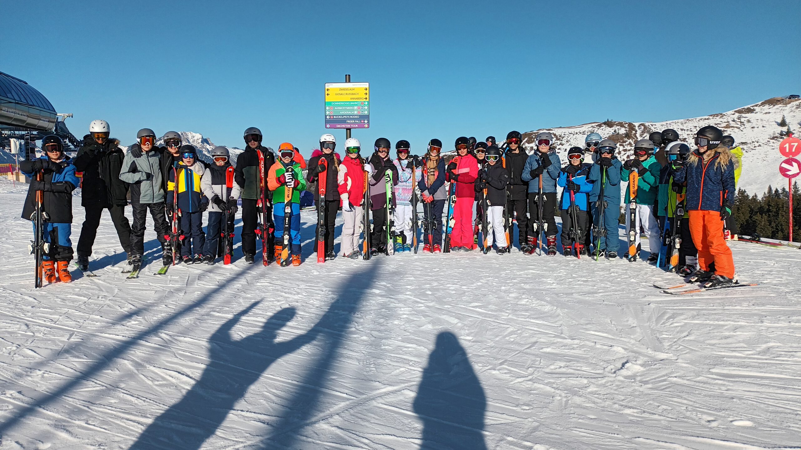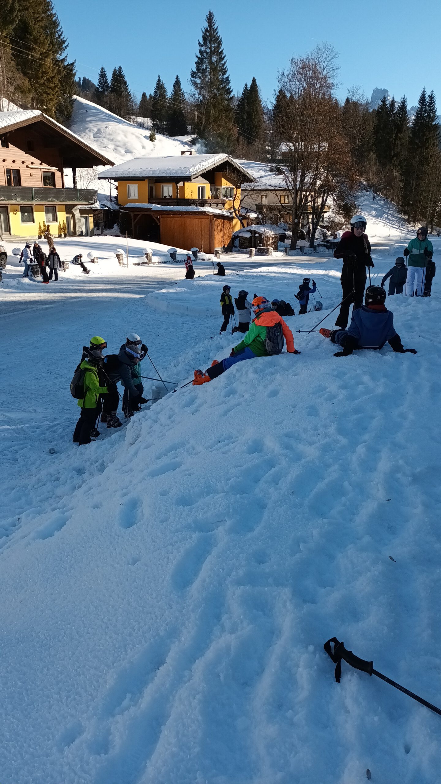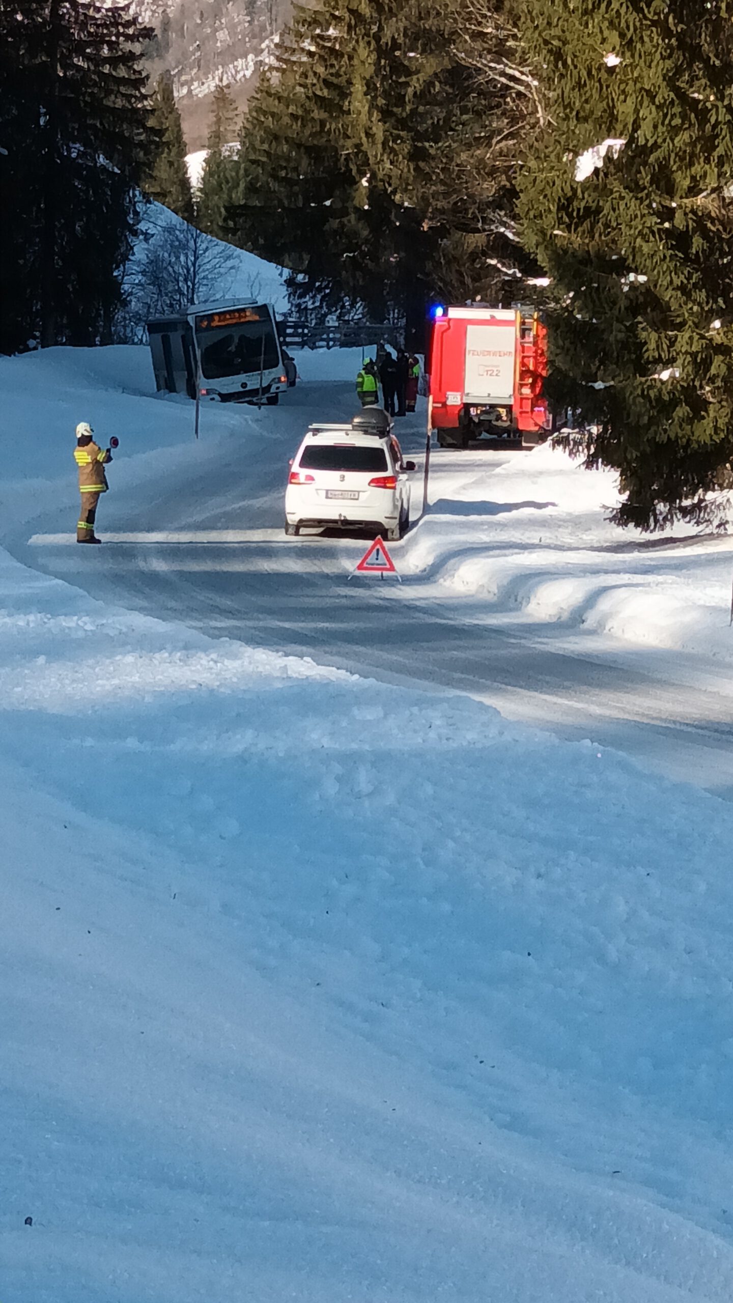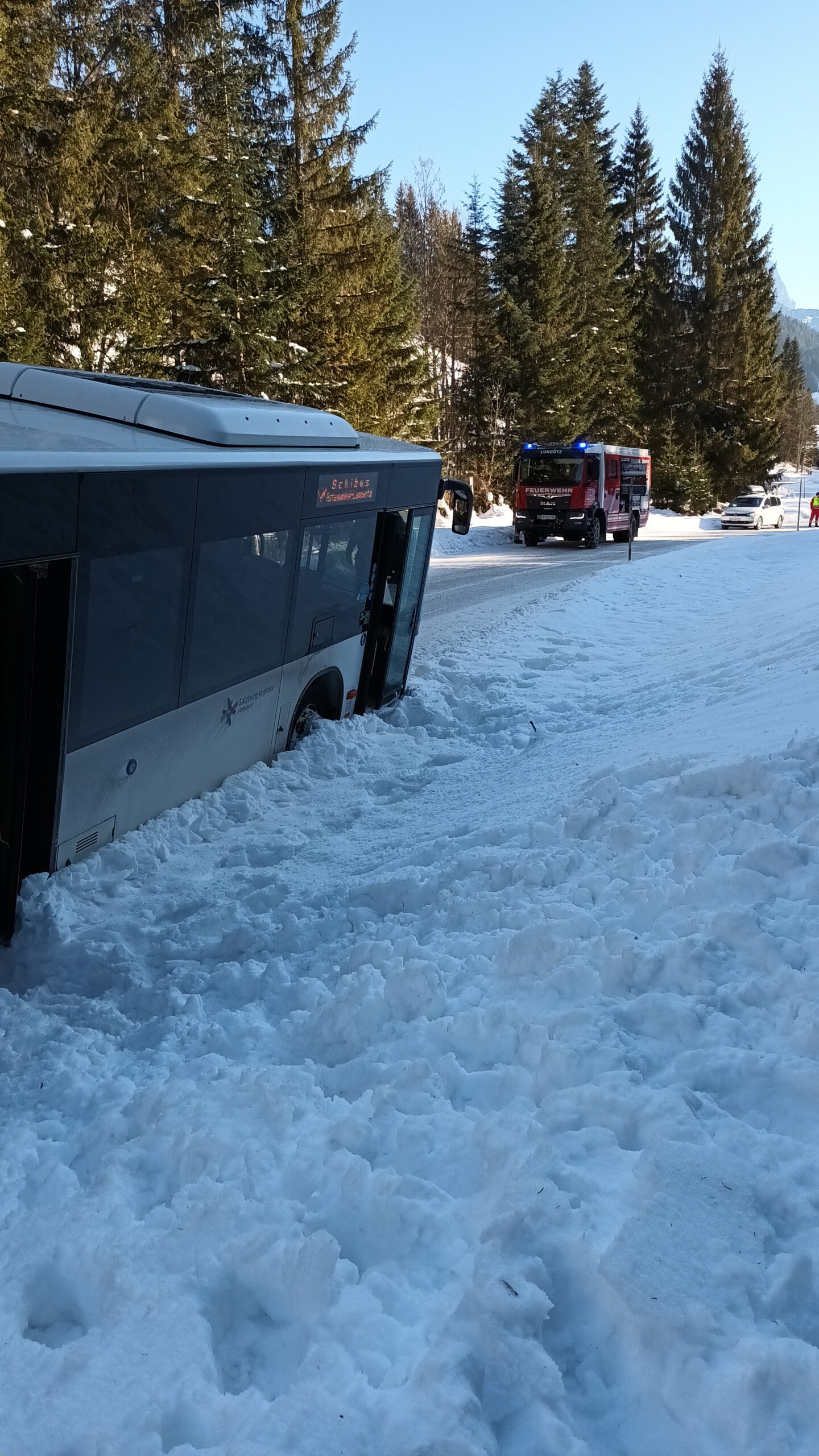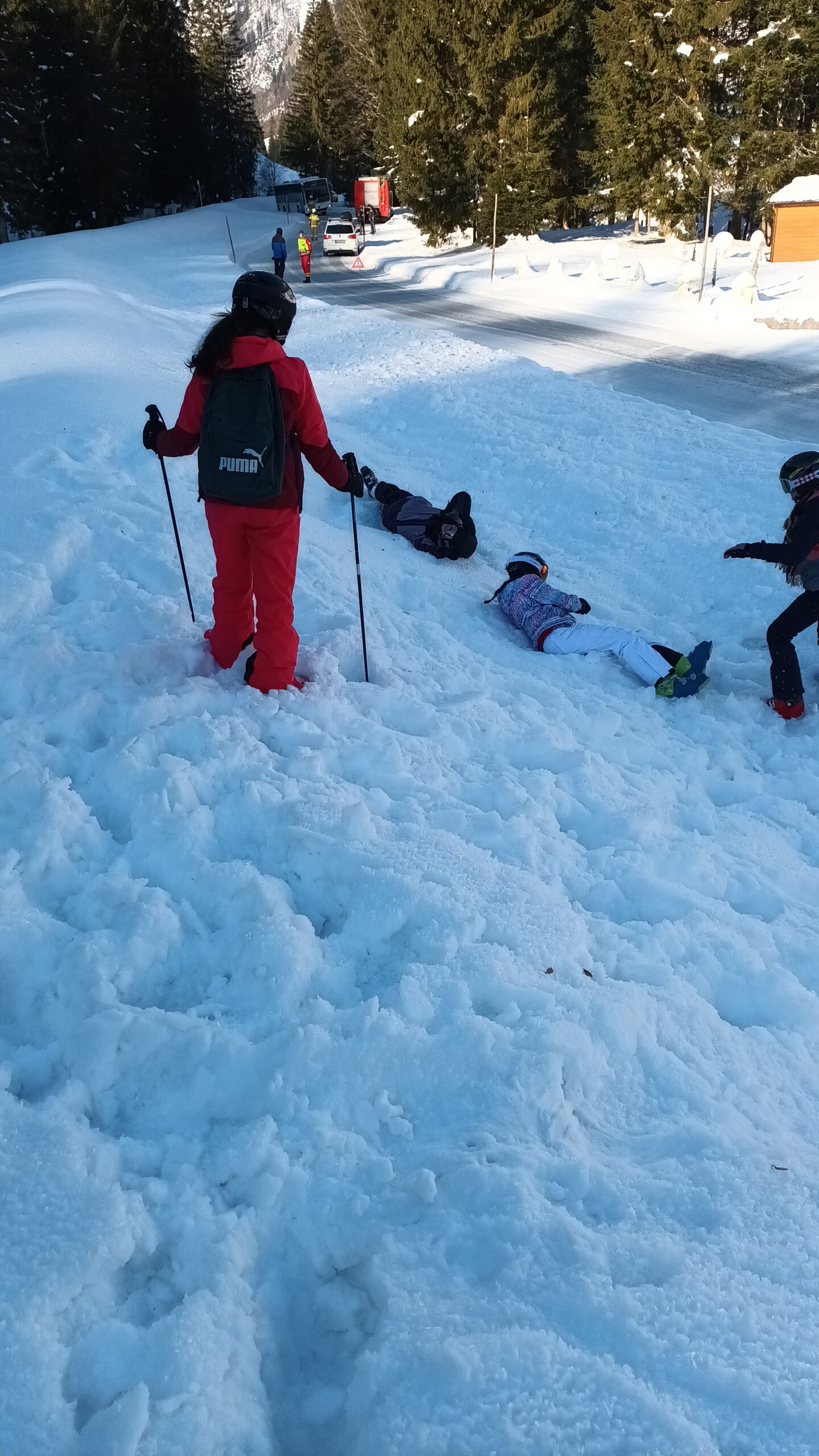Auf dem Weg zum Skigebiet fuhr sich am Dienstagvormittag der Skibus wegen eines entgegenkommenden LKWs im Schnee fest. Im Bus saßen zahlreiche Schülerinnen und Schüler des HGF, die den Bus verlassen mussten, damit die Feuerwehr den festgefahrenen Bus mit der Seilwieder herausziehen konnte. Die HGFler nutzen die Chance zu einer Rutschpartie bzw. Rollerfässchen im Schnee. Endlich im Skigebiet angekommen, ging es dann wieder für alle ans Skifahren, um das Können weiter zu verbessern. Tatsächlich sind nun alle Alpinskifahrer und Fahrerinnen der Klassen 7b, c und e im „richtigen“ Skigebiet und fahren kontrolliert die Kurven den Hang hinunter!