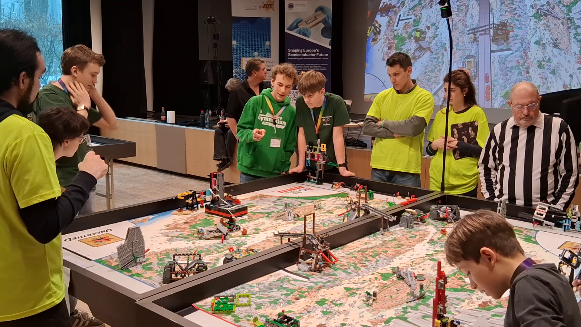 Nach letzten erfolgreichen Tests am Freitag, herrscht am Wettbewerbsmorgen Optimismus, doch dann: Katastrophe! Inder Nacht von Freitag auf Samstag hat LEGO ein Software-Update veröffentlicht, welches bei zahlreichen Teams alle Programme vom Roboter löscht. Beim HGF-Team, den TERMINATORS, herrscht erstmal Stillstand, denn das Update terminiert sich trotz zahlreicher Versuche der Fehlerbehebung bei exakt 70% stets selbst. Dominik, Max, Heiko und Kiara bewahren jedoch beeindruckende Ruhe. Hilfe in der Not kommt dann ausgerechnet von der stadteigenen Konkurrenz, den HLeGos, die uns ihren Backup-Mikroprozessor leihen. Die TERMINATORS sagen herzlich danke!