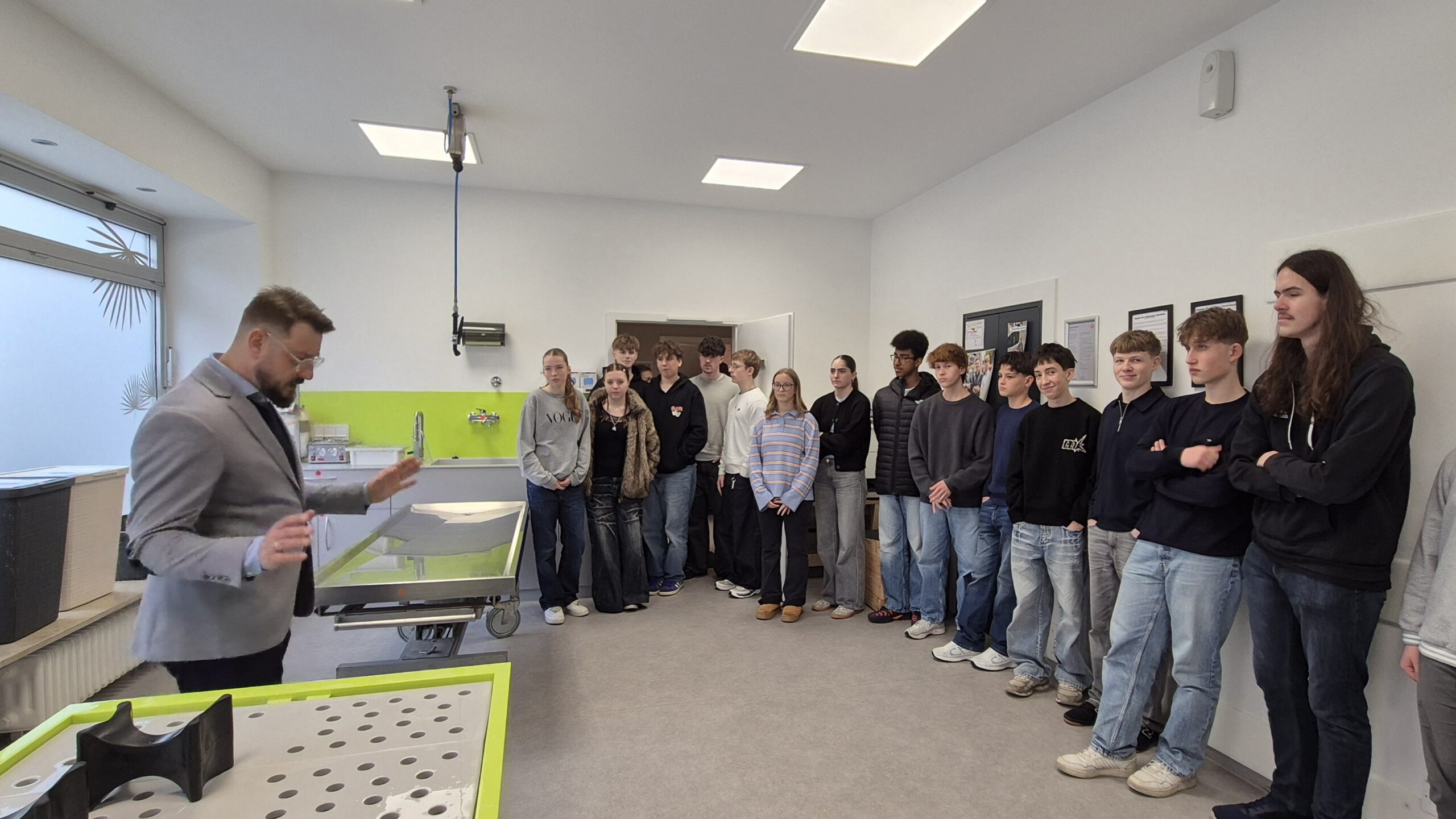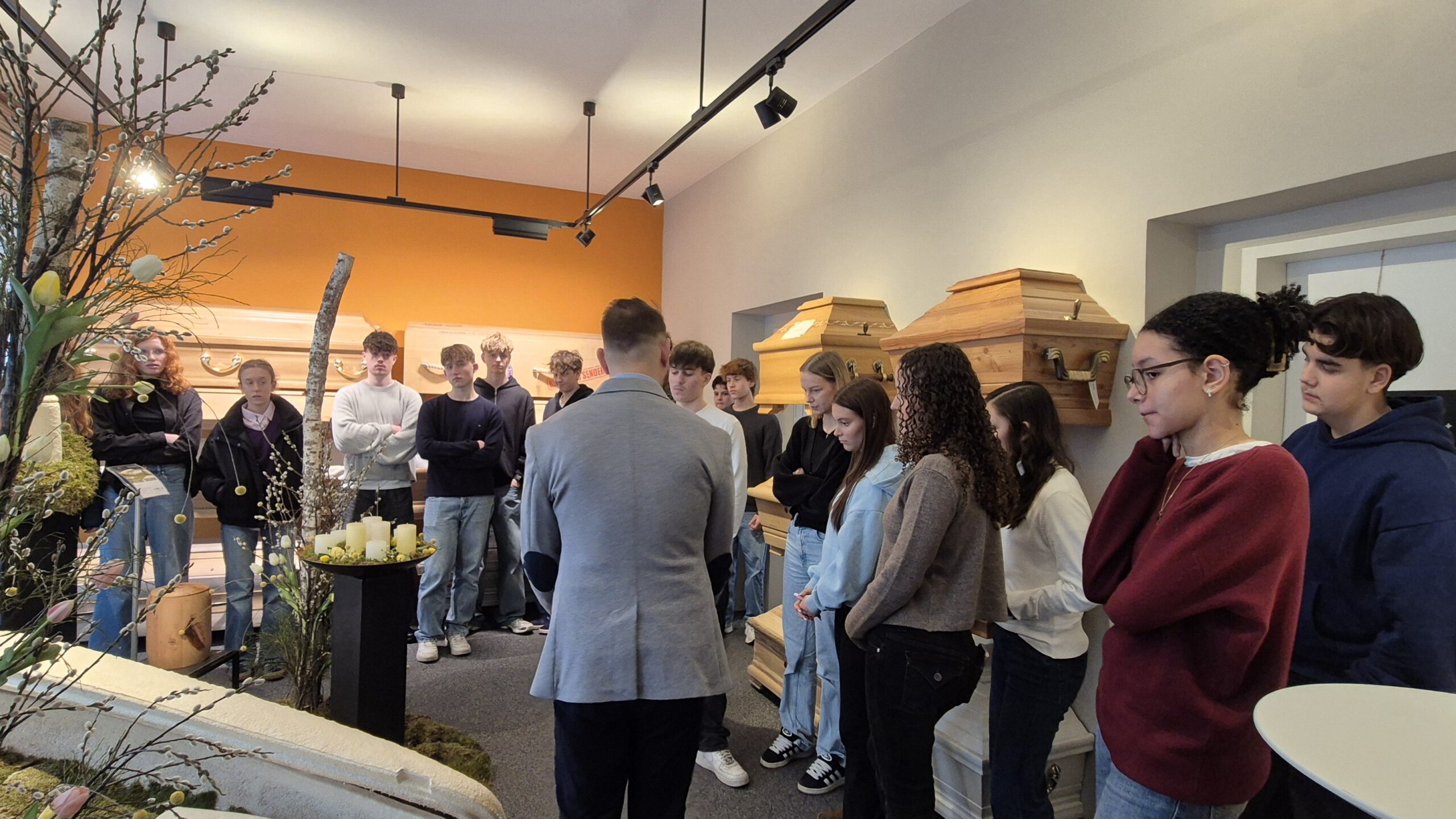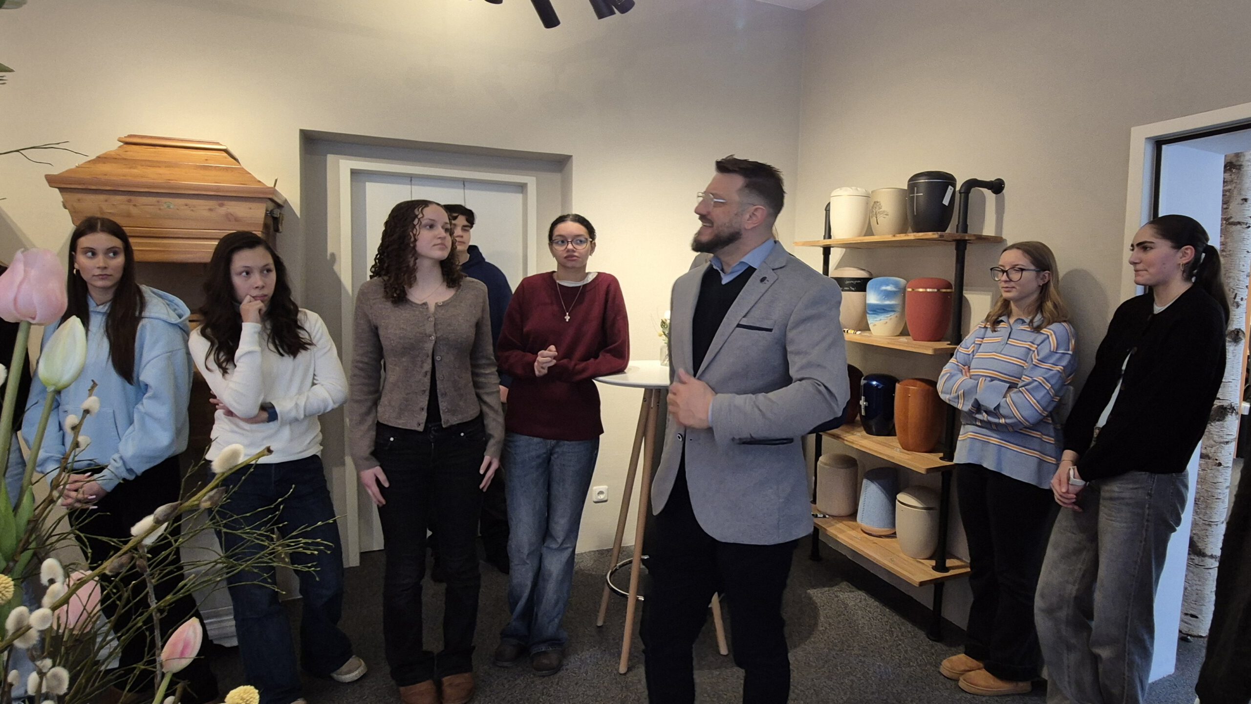 Die katholische Religionsgruppe der Klassen 10abcdef hat das Bestattungsinstitut Burger in Fürth besucht. Die Schüler nahmen zuerst an einem Workshop teil, der auf einer Holzbox basiert, in der sämtliche Dinge enthalten sind, die für das Thema “Tod und Bestattung” wichtig sind. Durch das gemeinsame Öffnen der Kiste und das Verteilen der Gegenstände wurde Einblick gegeben in sämtliche Abläufe, wie mit einem Verstorbenen im Trauerfall umgegangen wird und welche Bestattungsformen es gibt, wie es danach weiter geht und wie man Unterstützung auf einem Trauerweg erhalten kann. Anschließend führte Herr Diehl, der auch den Workshop leitete, die Jugendlichen durch die Räumlichkeiten des Bestattungsinstituts und die Klasse konnte den Ausstellungsraum mit Särgen und Urnen, den Waschraum, den Kühlraum, die Gesprächsräume und den Abschiedsraum besichtigen.