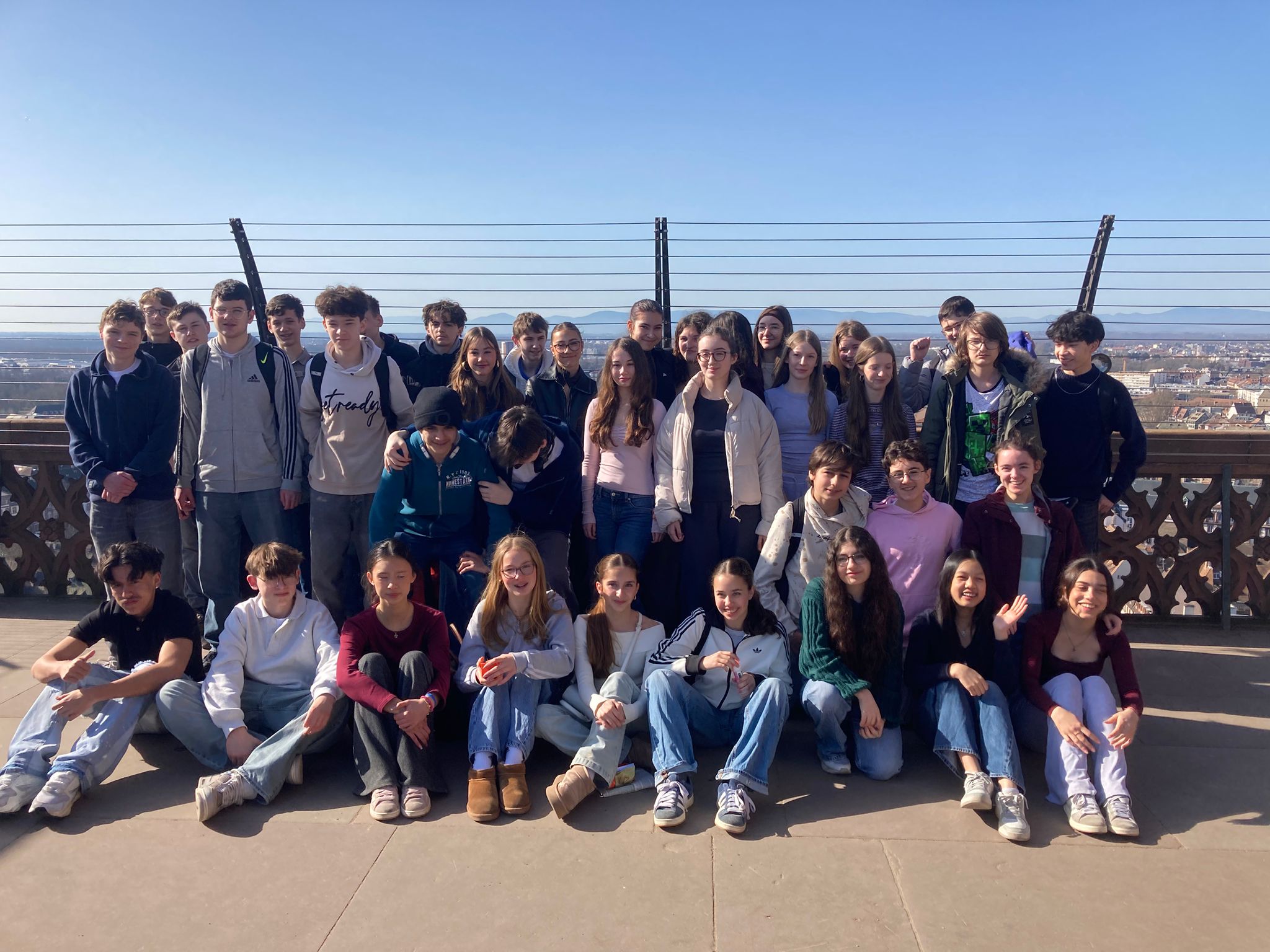 Am Freitagmorgen stand eine Stadtrallye auf dem Programm, mittags ging es hinauf auf die Aussichtsplattform des Straßburger Münsters – viele Stufen, aber ein weiter Blick bis zum Schwarzwald und den Vogesen.Das herrliche Wetter lud uns alle zu Crêpes und Kouglof am Ufer der Ill ein, sodass wir am Nachmittag in bester Stimmung die Heimreise antreten konnten.